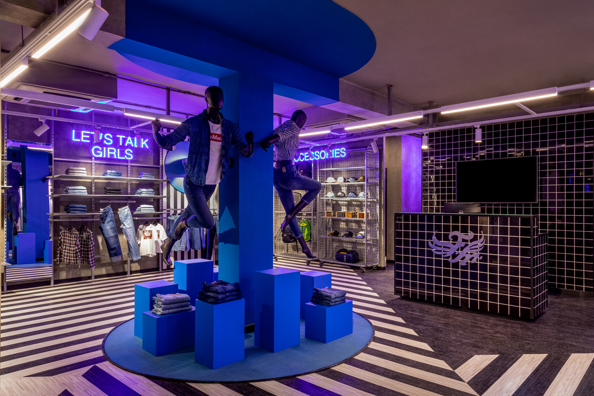 The unconventional design of the fixtures, plays an important role inside the store with their clinical and futuristic look. The glossy pieces are cutting-edge, but not distracting from the product itself. The denim fixtures surrounding the columns, create a panoptic structure enveloping the customer. They are the blue beating heart of the store. Sleek design combined with the right lighting gives the fixtures a sophisticated technological edge. At the outset, the angled facade makes a loud and unapologetic statement. A key ‘WOW’ factor. To retain the raw nature of denim, the shell of the store is made to look untreated. Blue splashes dominate the space, through columns details and electric signages. Irreverent stripes on the floor mixed with unconventional black tiling add to the graphic punch. Flying mannequins float defying gravity, and are crystallized in gymnastic movements and poses, denoting the flexibly of denim. Rules are meant to be broken, expectations are meant to be surpassed. The new Flying Machine store designed by Restore does all that and much more, Welcome to the new cool.