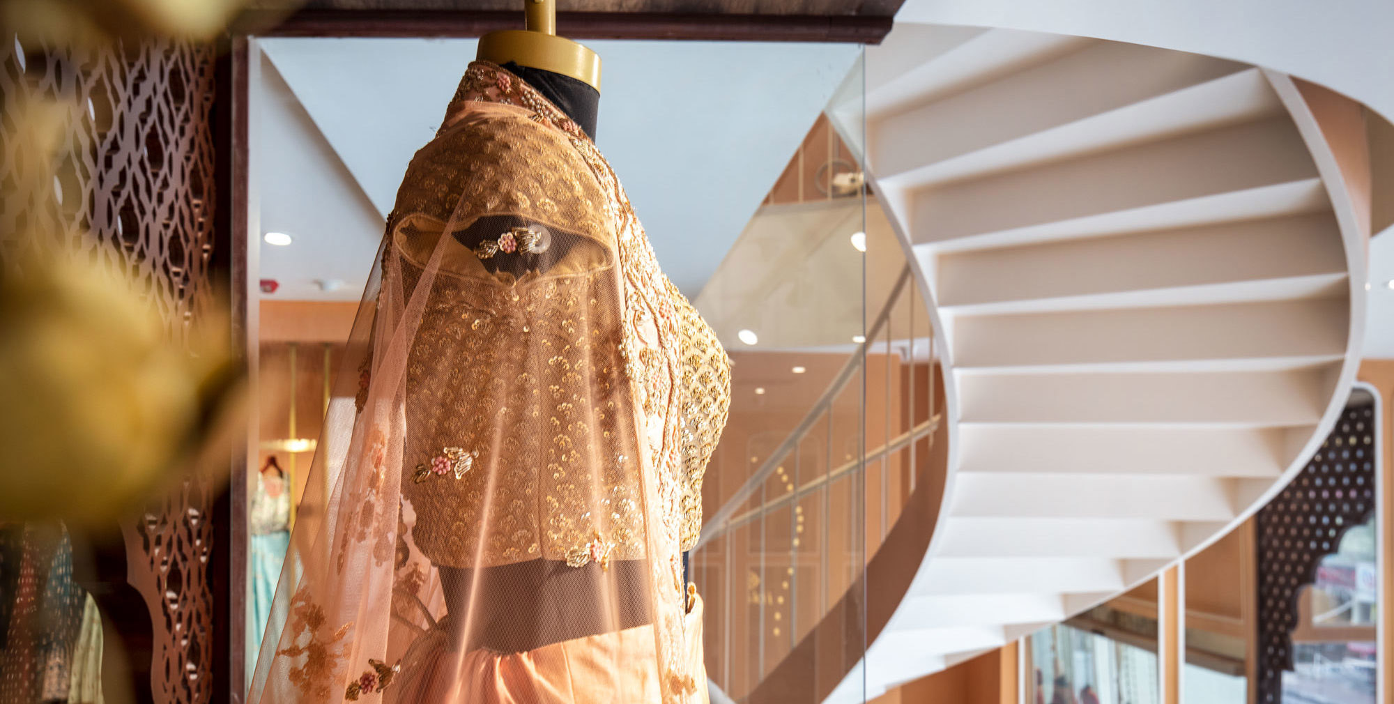 The large & grand entry staircase gives the bride a sense of royalty, as she begins the preparations for her big day. The double height ceiling, accentuated with a bronze mirror and a chandelier, signal grandeur. The product presentation on mannequins beneath the “Haveli” arches on the mezzanine accentuate a sense of exclusivity. The décor lights, fitting rooms, product displays and selections, all magnify the sense of celebration and joy that envelopes a home when a wedding is to take place.