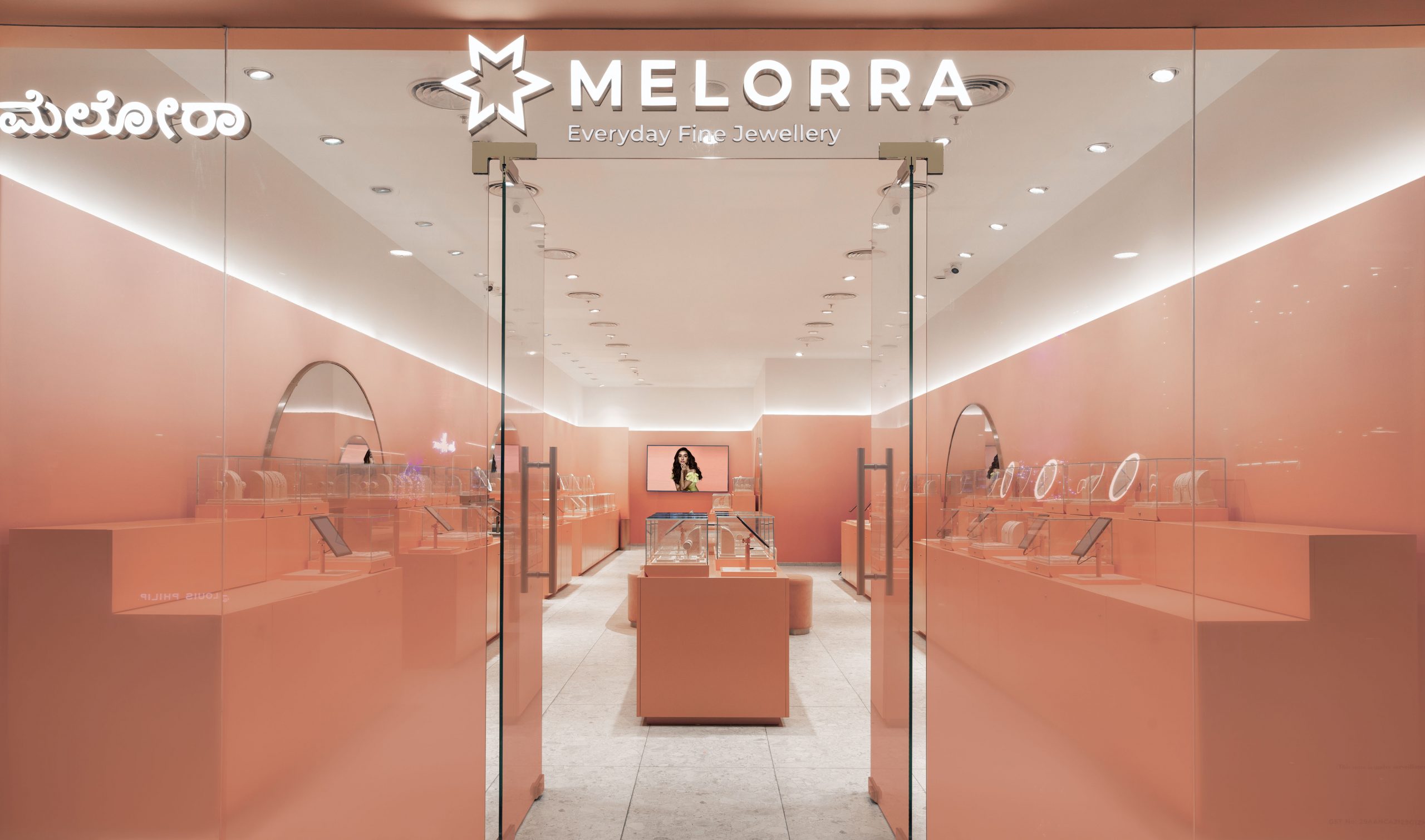 The façade is an ombre of “Melorra Blush”, a colour we developed together with the brand. The subtle tone on tone materials enable the store to be iconic and recognisable. It reveals a femininity and freshness that is so far unseen in the world of fine jewellery in India.