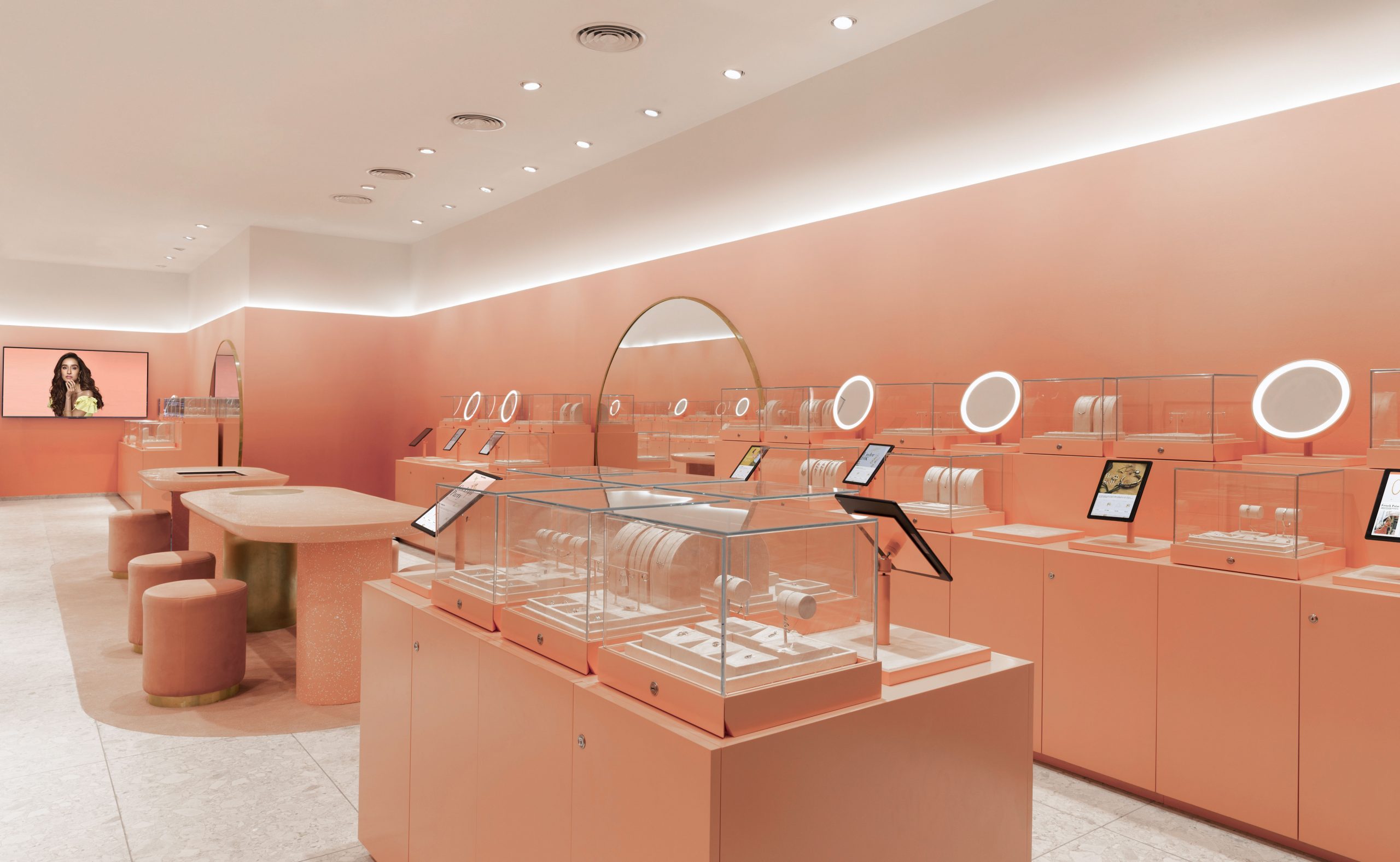In order to modernise the way of selling fine jewellery, the fixtures are custom designed to be agile and the jewellery is more accessible to the shopper. Each element is specially engineered to be modular, permitting the store to configure numerous merchandising options. The digital interfaces are programmed to display the right content beside the related collection, encouraging brows-ability as well as providing fashion information relevant to each of the jewellery collections. The central “Bliss Bar” allows for customers to try out products and further check out merchandise available in both the online and the offline stores. The “New this Week” section is bathed in gold to draw attention to new products based on the hottest trends. The large mirrors amplify the space and provide a softness to the overall design, while the linear layout of the fixtures bring order and clarity.