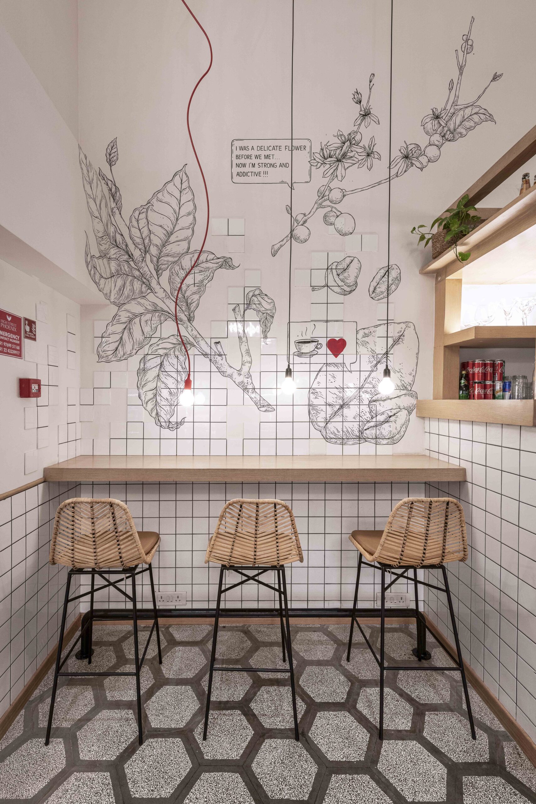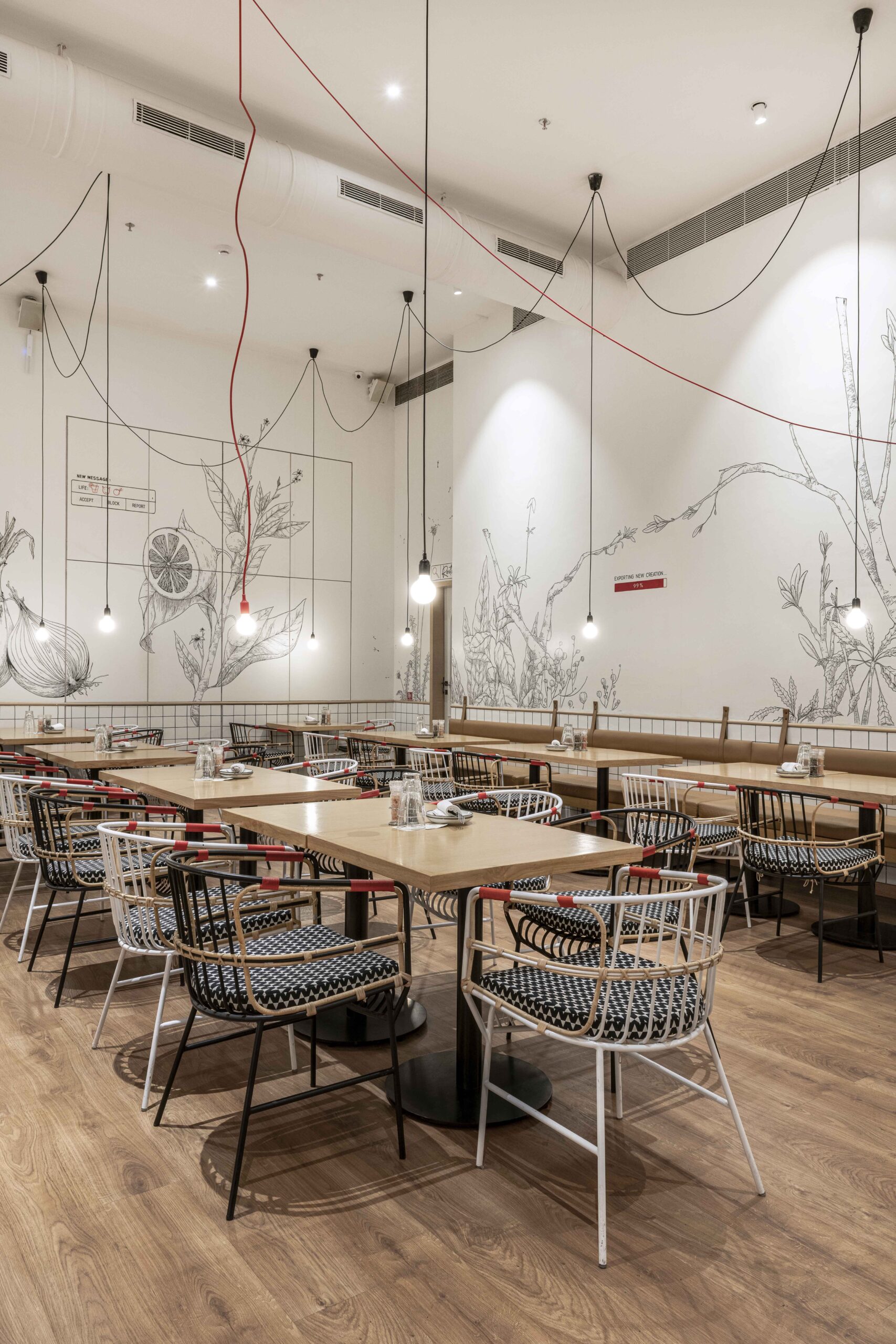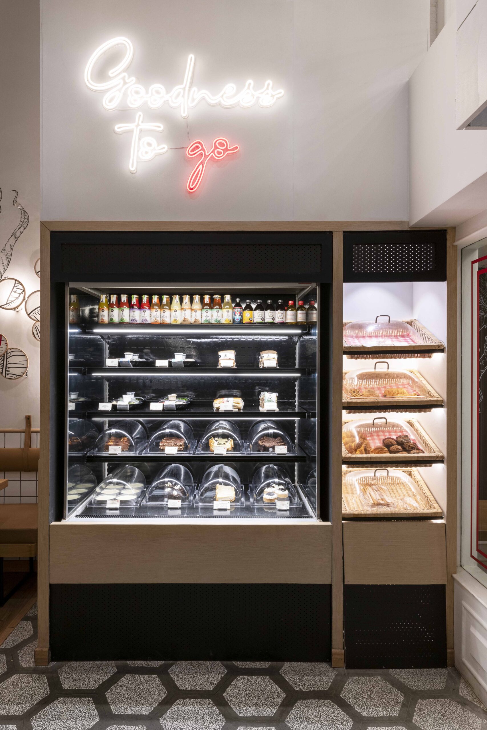 The narrow entry had to be maximised for impact through a cosy yet attention grabbing outdoor seating, created by recessing the secondary facade. The ‘goodness to go’ section complete with the ledge seating are laid out at the front, followed by the expansive bar , that draws the consumer through the length of the space. The artwork done with Priya Dali, talk of food, in a technological time. The ingredients that pull this together remain as in the 2.0 concept – adding texture to the walls, amusement through the art, freshness through the materials and ultimately delight the customer with the whole picture.