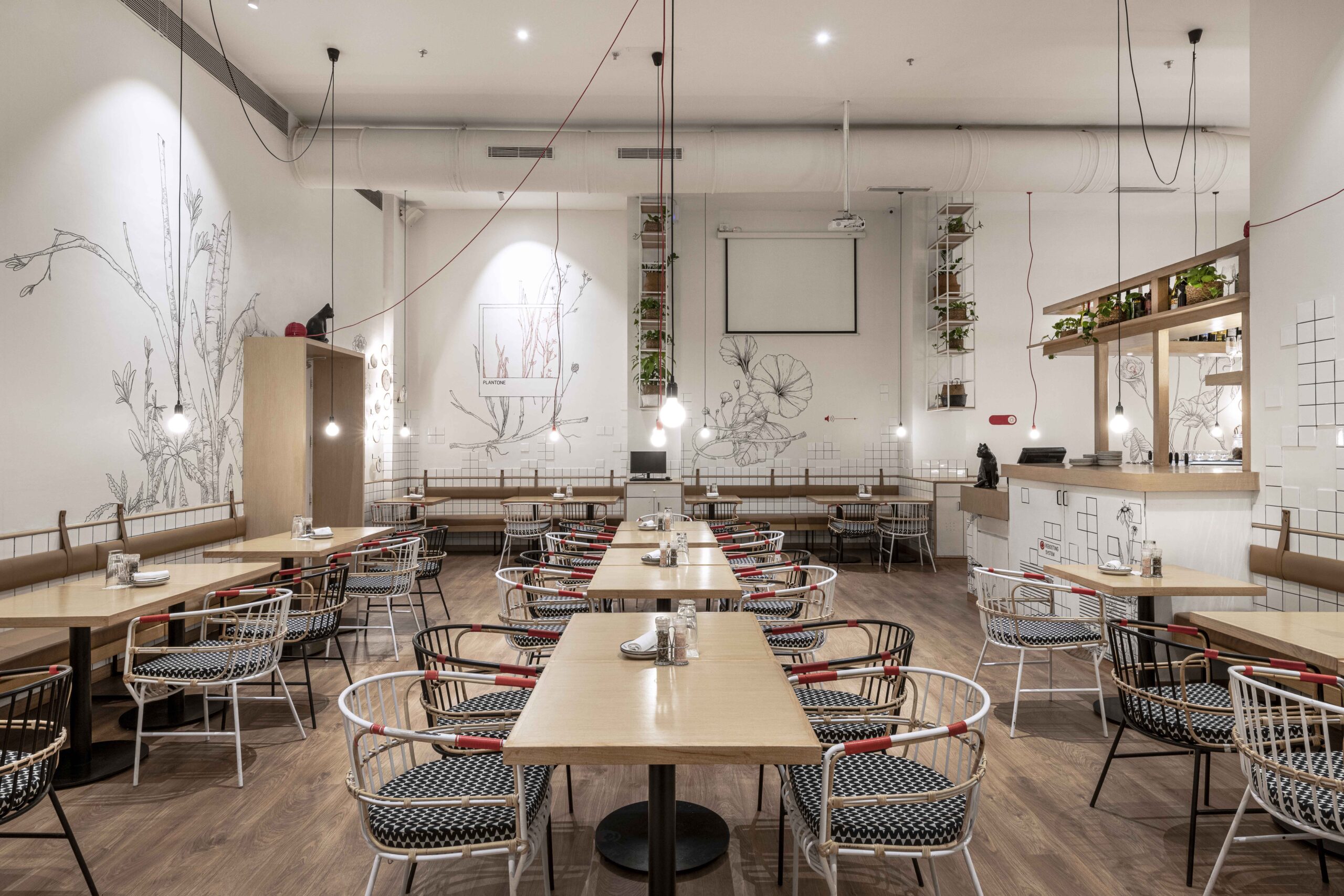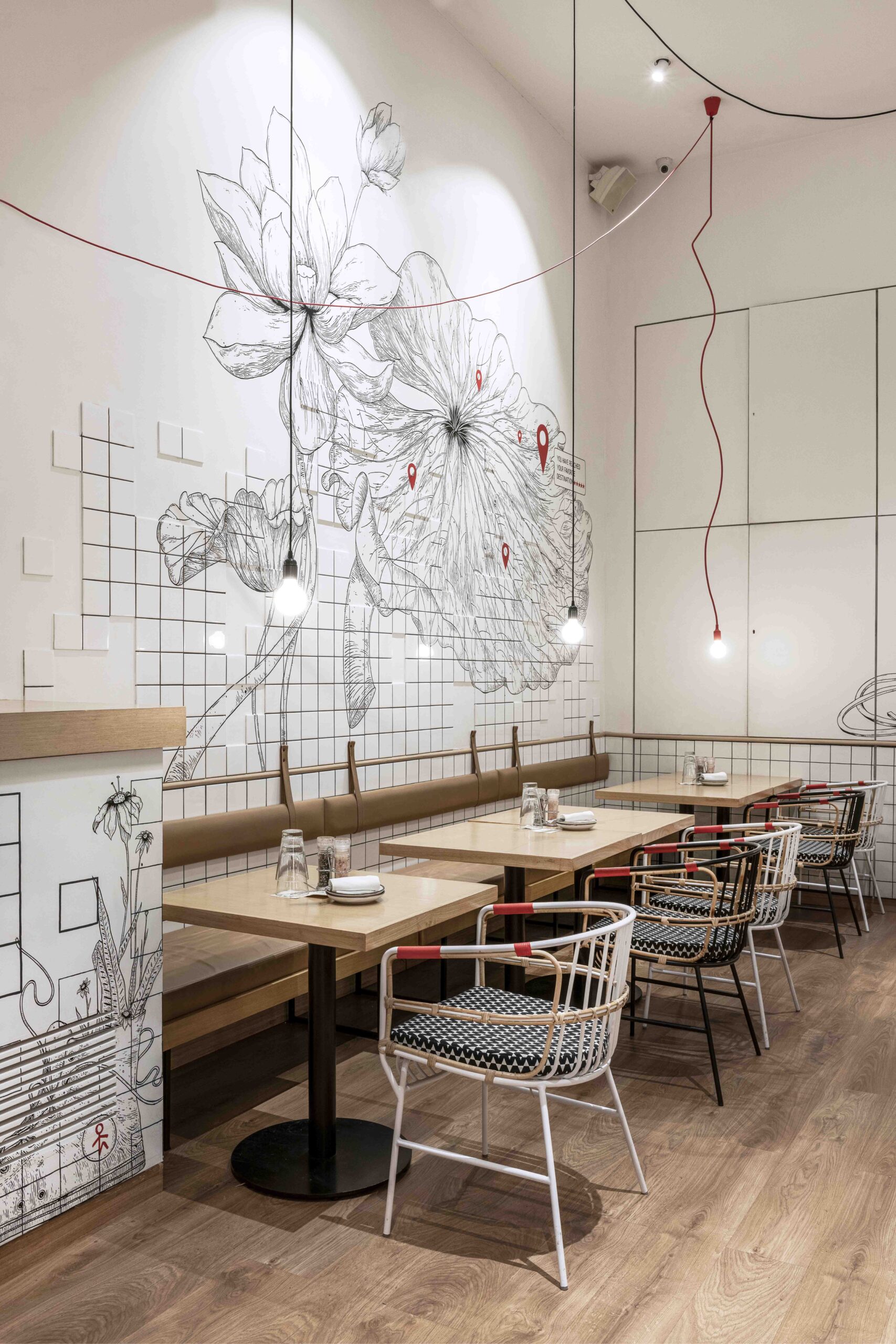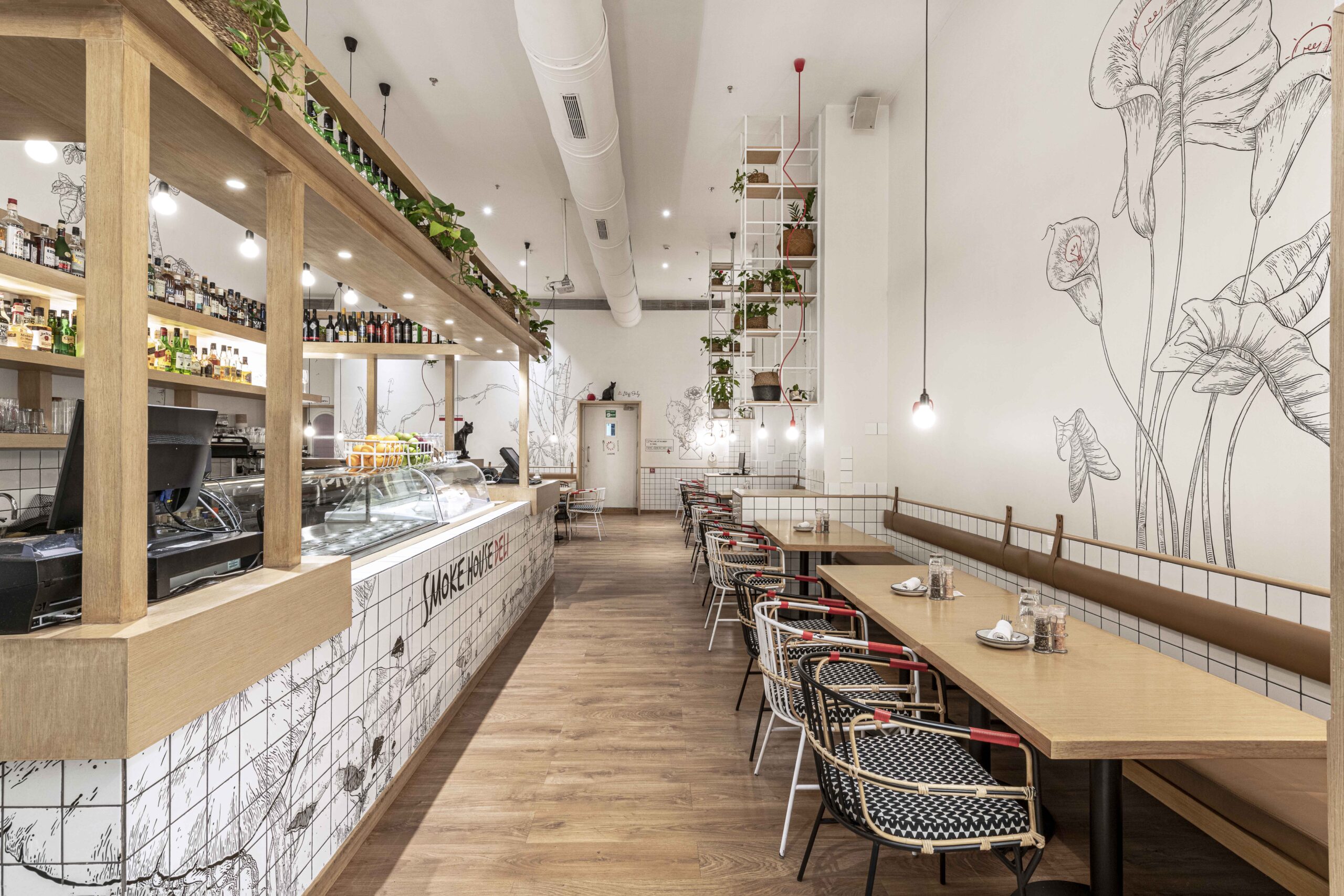 The narrow entry had to be maximised for impact through a cosy yet attention grabbing outdoor seating, created by recessing the secondary facade. The ‘goodness to go’ section complete with the ledge seating are laid out at the front, followed by the expansive bar , that draws the consumer through the length of the space. The artwork done with Priya Dali, talk of food, in a technological time. The ingredients that pull this together remain as in the 2.0 concept – adding texture to the walls, amusement through the art, freshness through the materials and ultimately delight the customer with the whole picture.