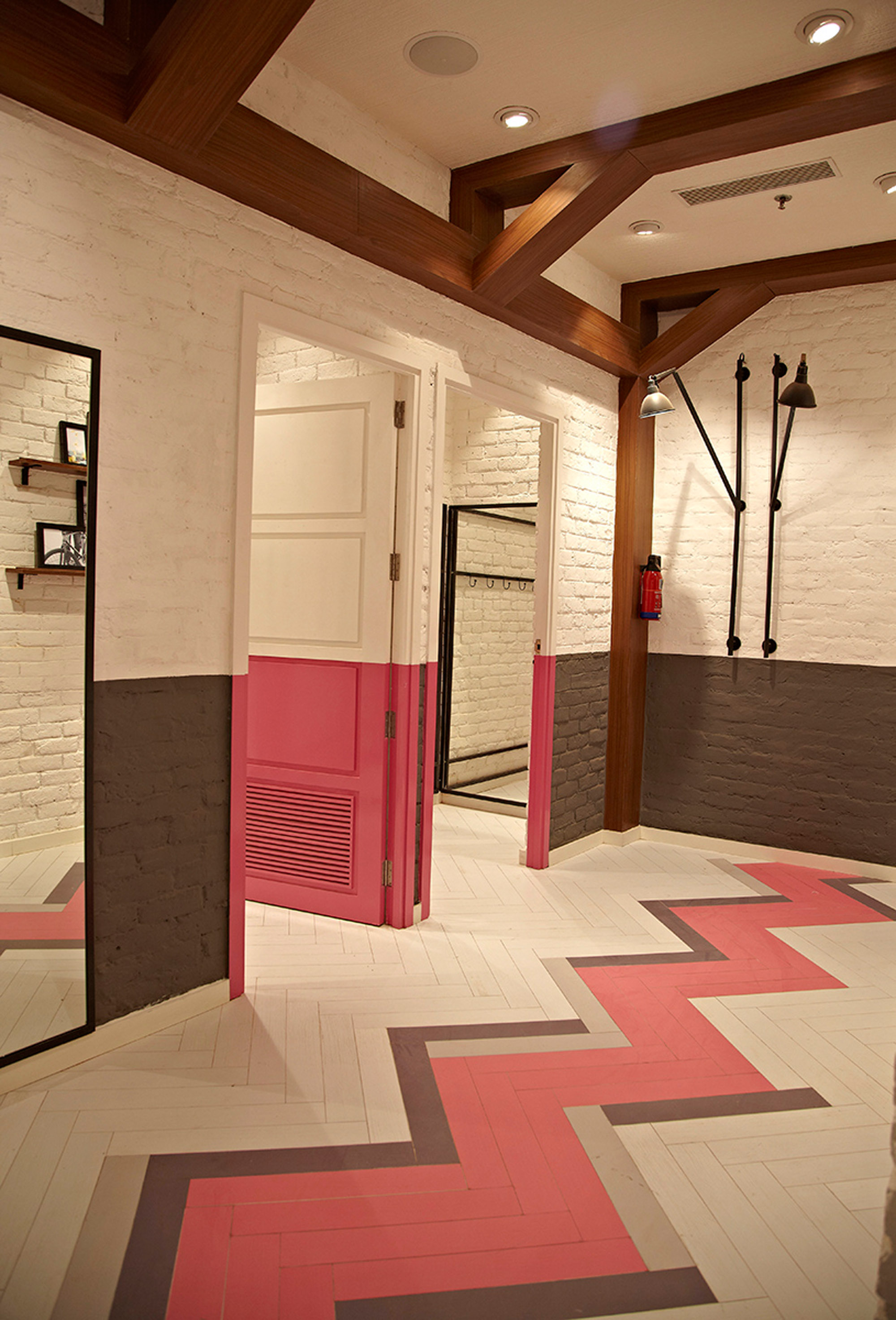 The loft-themed space is an unusual mix of contemporary minimalism and modern vintage. We turned the front facade and entry into an angled walkway done in glass with a simple metal frame. The space exudes a warm yet modern vibe with the use of white washed brick walls, concrete washed ceilings and white wooden floorings mixed with the use of brand colours. We even paid tribute to the brand’s roots with furniture that is inspired from the modern English vintage. This eclectic collection adds a lively touch to the space.