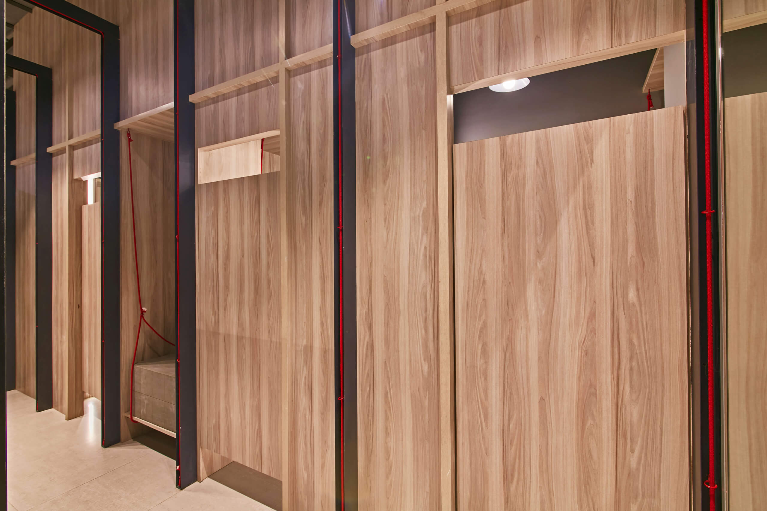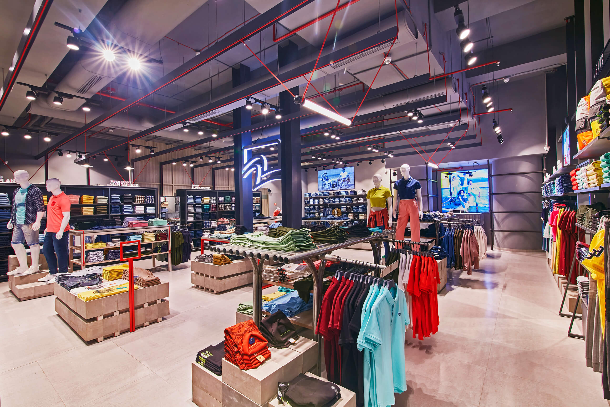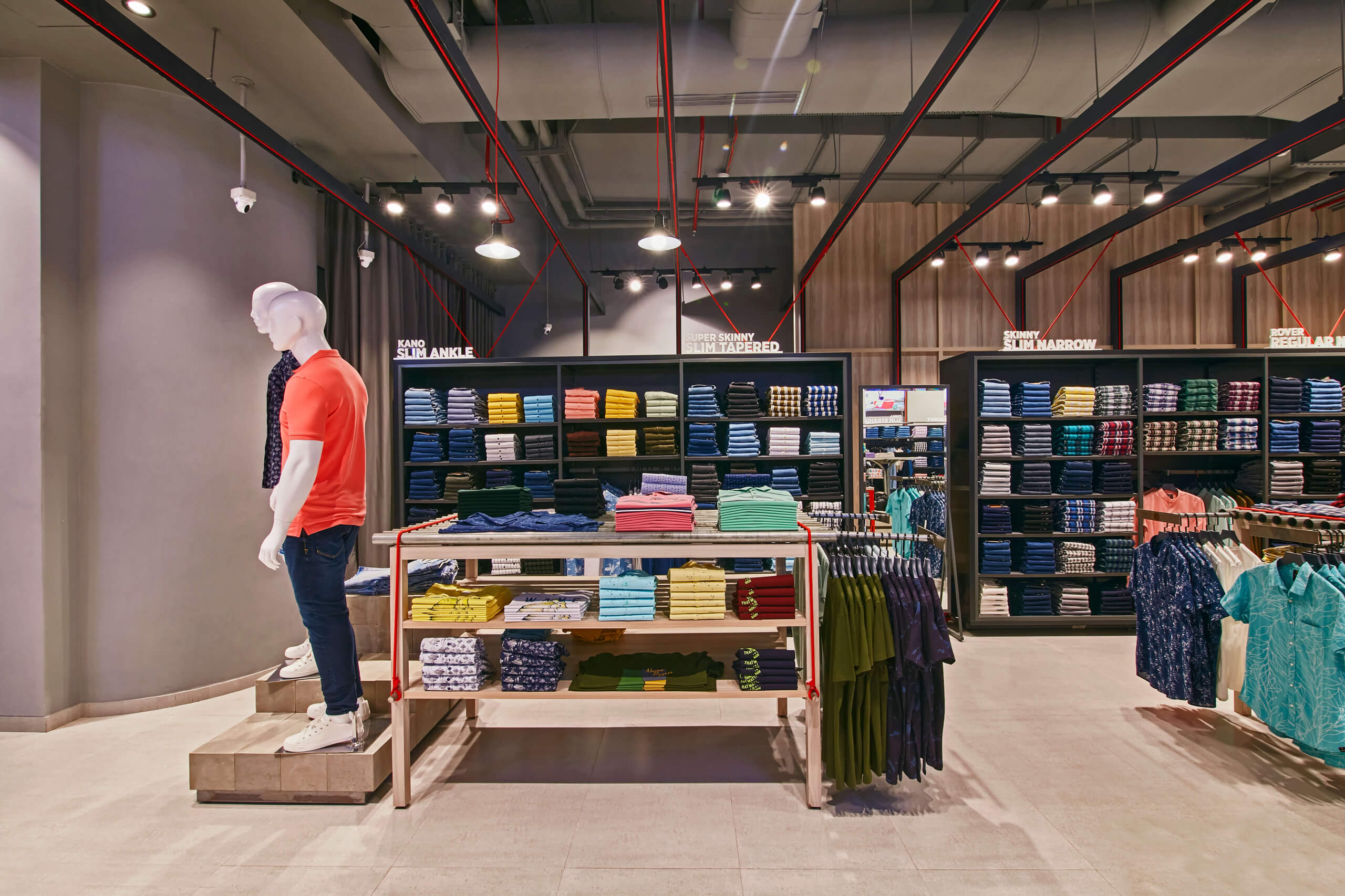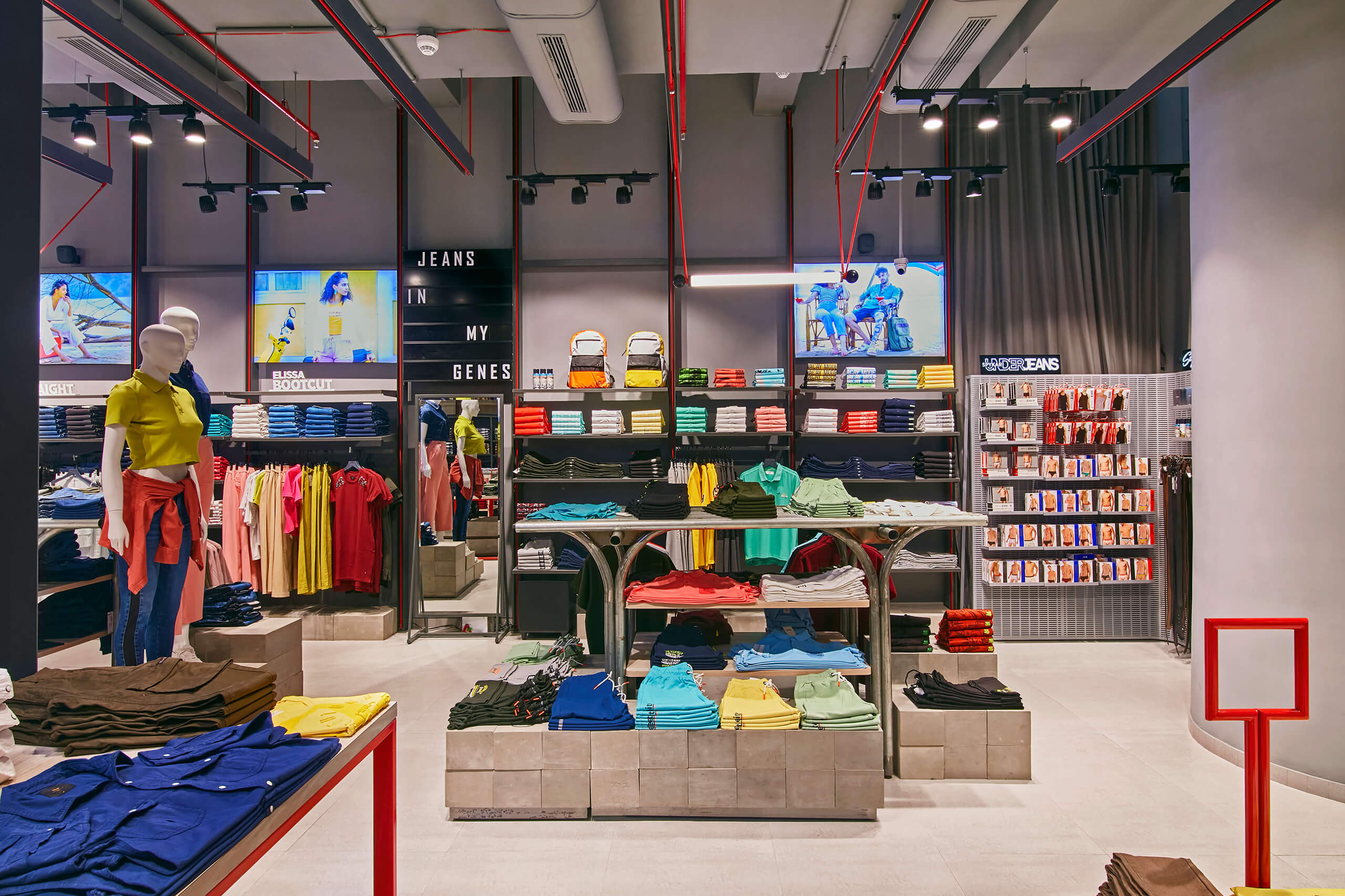 The concept is drawn from a work-in-progress construction site bringing to the foreground the use of materials, tools and temporary structures which are typical only behind the scenes. The store’s design is a physical manifestation of Spykar’s core values of innovation, adaptability, and continuous growth. The use of construction-themed elements not only makes a bold visual statement but also metaphorically represents the brand’s identity of being a work in progress, always striving towards improvement and evolution. Utilizing elements like steel sections, scaffolding, metal pipes, and AAC blocks, the store mimics a construction site, offering an unconventional and striking visual appeal. The brand’s signature red color is used to draw attention to the construction site elements in the form of ropes strung across the store and tied into the fixtures, suspended lights, handles, and frames of mid-floor fixtures designed as loading pallets and racks.