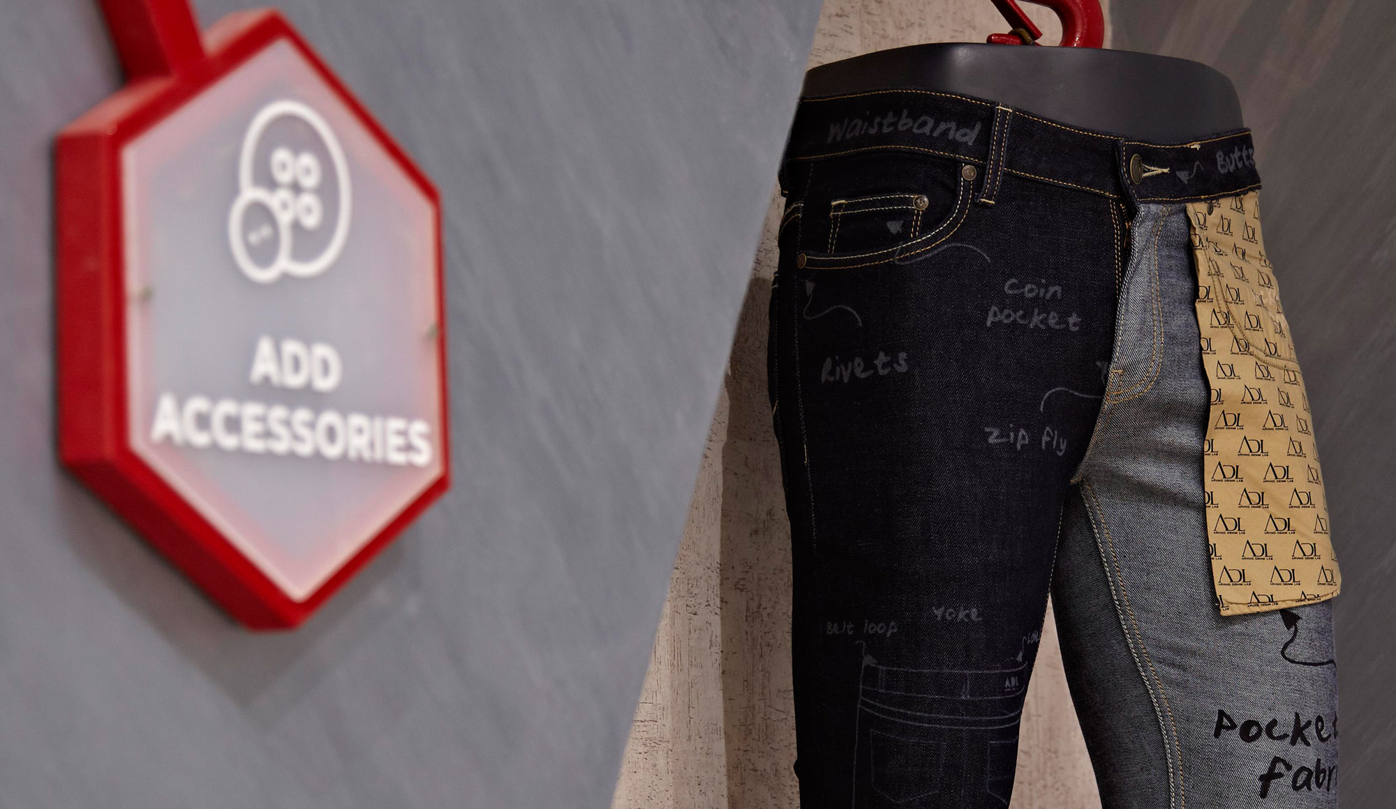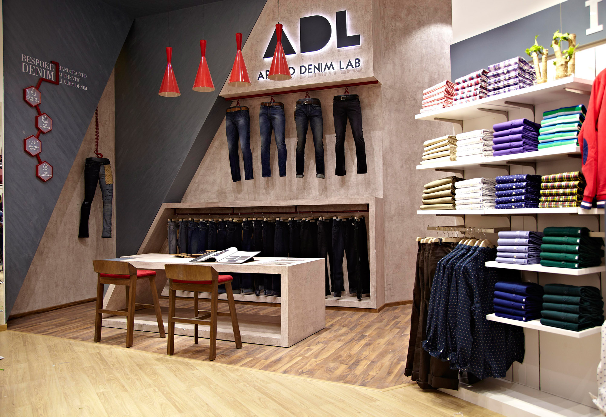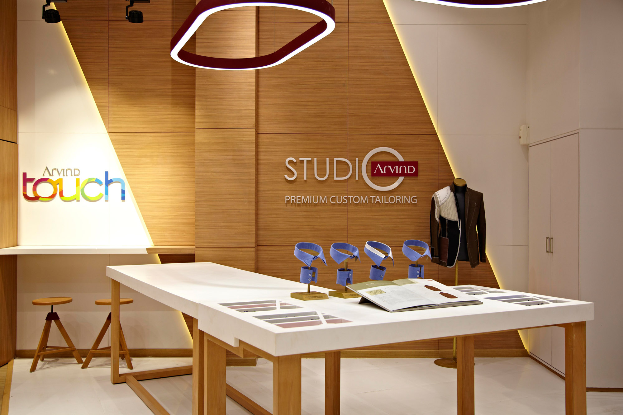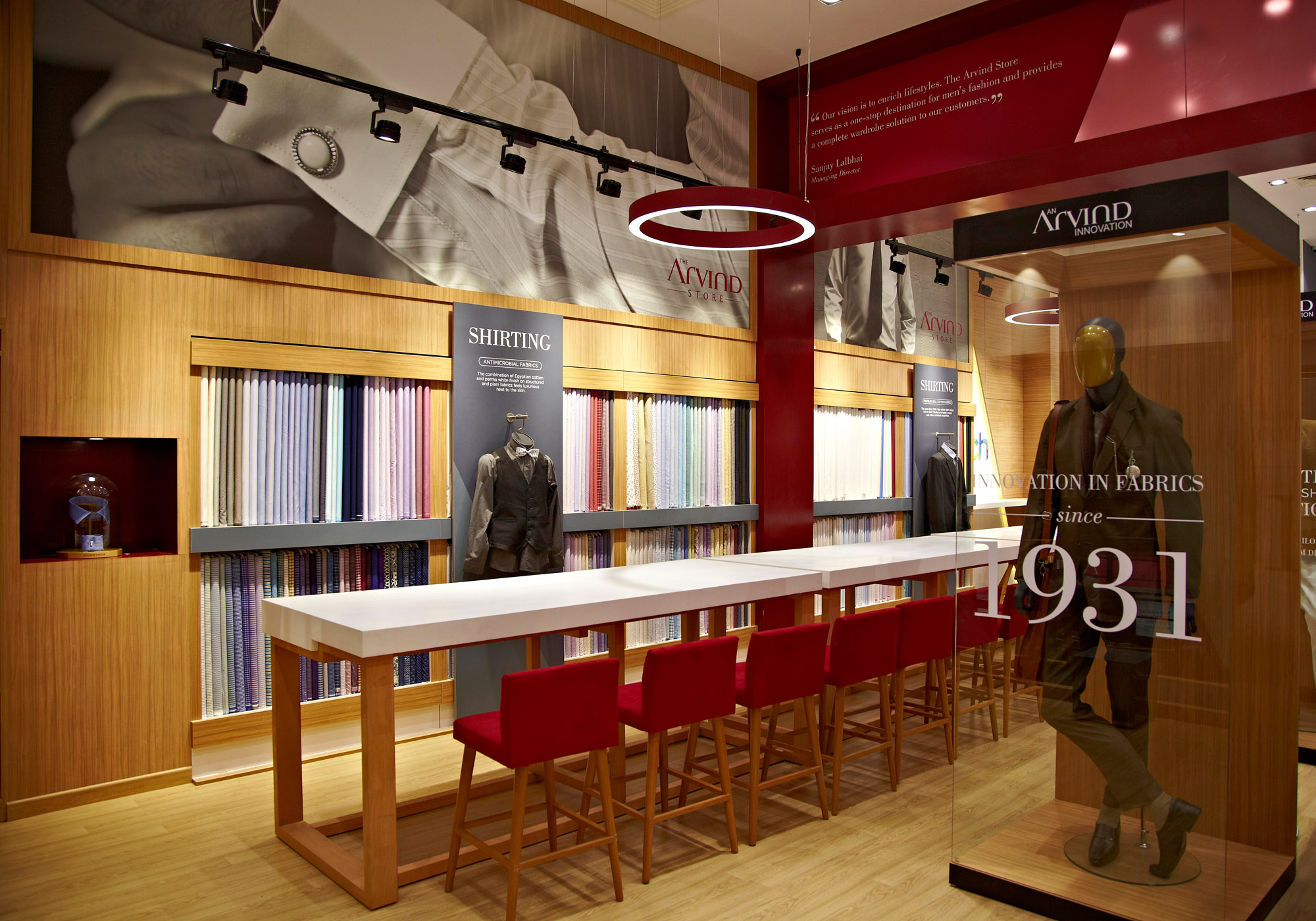 We chose to use the distinctive brand colour and the ‘A’ of Arvind as design motifs. These were carried through the four zones of the store. Each zone was designed to highlight the strengths of the Arvind Brand: from fabrics to design, from tailoring to ready-made brands.