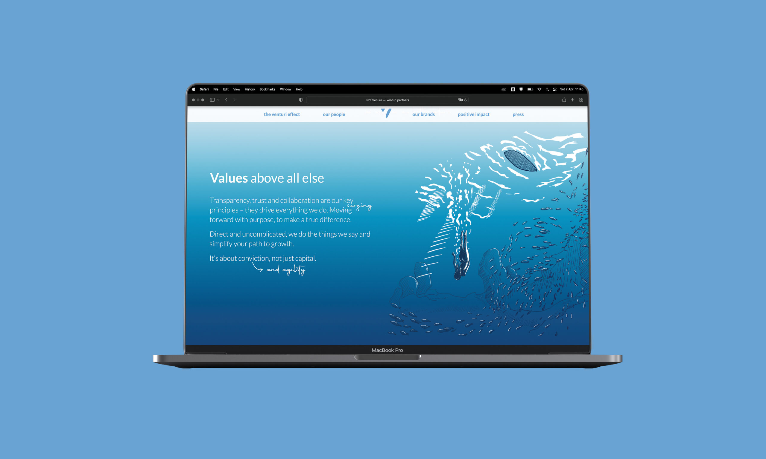The primary goal was to make the brand relatable to the consumer sector-focused space. The design also brought to focus the reason behind the naming of the brand – the venturi effect, a physical phenomenon that increases velocity while decreasing pressure. As well as incorporating the founder’s own love for paragliding – a revealing human touch that is unusual in the world of investment.