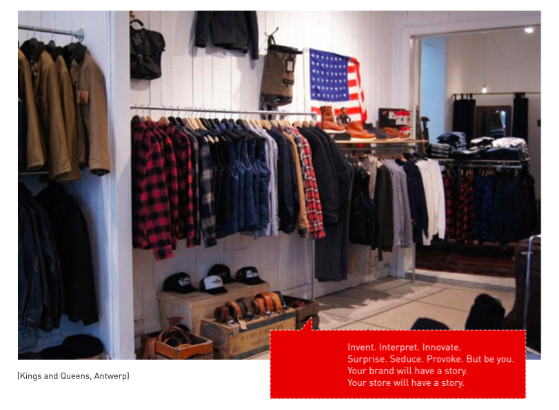 In sum, designing a cut-through, differentiated experience begins with a belief. It doesn’t matter what the belief is, as long as it is true and authentic. It becomes the source of enormous confidence and inspiration. Which in turn creates a springboard for product designers, retail designers, visual merchandisers and communication specialists to express themselves. To tell stories in retail and in brand communication.